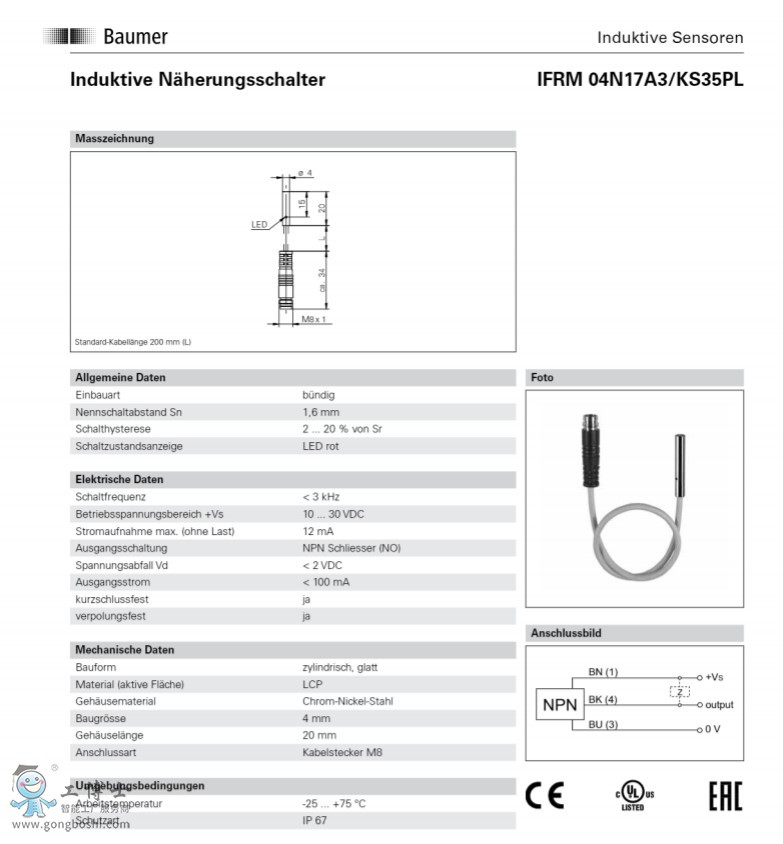 Baumer/堡盟IFRM 04N37A3/PL電感式接近開關(guān)傳感器