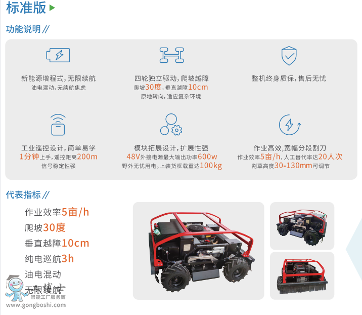 1、油電混合動力電機(jī)驅(qū)動行走,發(fā)動機(jī)割草工作,油耗低節(jié)約成本。
