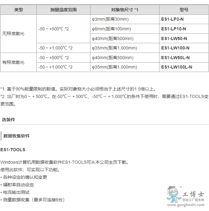 使用專用軟件ES1-TOOLS (可從網站免費下載)作為設定工具,可變更溫度的監控、輻射率、移動平均功能、輸出范圍。