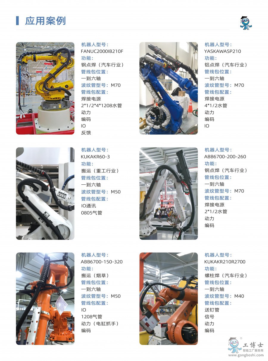 ABB機器人管線包、KUKA機器人管線包、FANUC機器人管線包、安川機器人管線包、柯馬機器人管線包、川崎機器人管線包、那智機器人管線包、OTC機器人管線包、現代機器人管線包、遨博機器人管線包、優傲機器人管線包、愛普生機器人管線包、松下機器人管線包、埃斯頓機器人管線包、錢江機器人管線包、廣數機器人管線包、新時達機器人管線包、匯川機器人管線包、柴孚機器人管線包等。