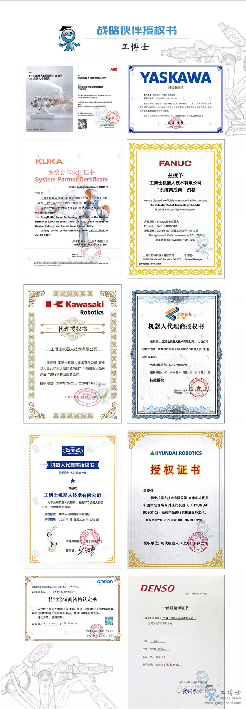 工博士機器人技術有限公司致力于為您提供ABB、庫卡KUKA、安川YASKAWA、發那科FANUC、歐地希OTC、川崎Kawasaki、遨博AUBO、現代HYUNDAI、電裝DENSO、歐姆龍OMRON、愛普生EPSON等進口機器人銷售、項目集成、機器人代理、機器人配件、機器人售后維保、機器人培訓一站式服務等優質服務!!!