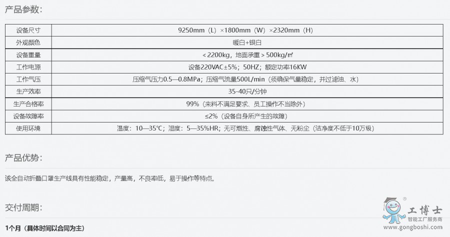 本設備用于折疊口罩自動成型:整卷原材料經過放卷、滾輪驅動、放鼻夾、焊接包鼻夾、(充氣閥孔選配)、(印刷選配)、耳帶焊接、對折疊、封邊焊接、裁切、成品下料、余料下料等工藝,通過流水線輸送流出。全部過程全自動實現。