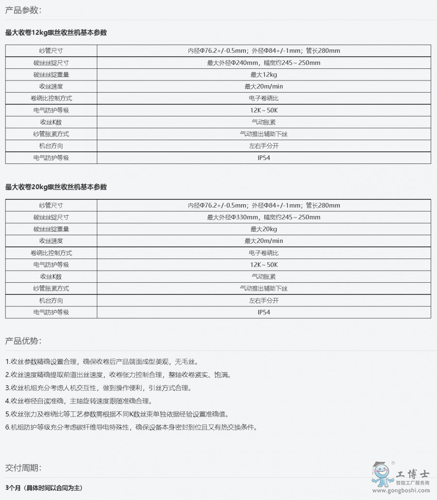碳纖維自動換卷卷繞收絲機,可有效的將碳纖維順利纏繞在空卷上進行卷繞。采用全新的勾拉切斷形式,在空卷卷繞的同時拉緊空卷和滿卷之間的碳纖維,從而能夠使切絲機構自動切絲。采用全新的輔助推出下絲機構,后期可配套使用機械手下絲上紙管,實現全自動操作,提高效率,降低50%用工人數;方便收絲時使紙管與氣脹軸緊配合,而松配合時,輕松放卷芯、取卷芯,配合自動下絲功能,滿足高品質碳纖維的生產要求。