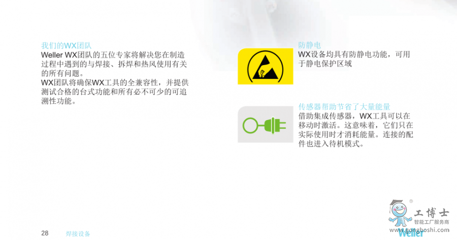WellerWX焊臺使手動焊接過程更安全。對于汽車、航空航天和醫療技術行業而言,焊接安全性是一項關鍵要素。WX焊臺通過溫度和工具鎖定以及工具溫度設置來保證焊接安全性。