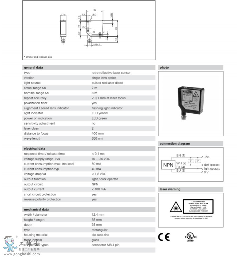Baumer 堡盟傳感器 OPDM 16P5103/S14 鏡反射式光電傳感器開關 |