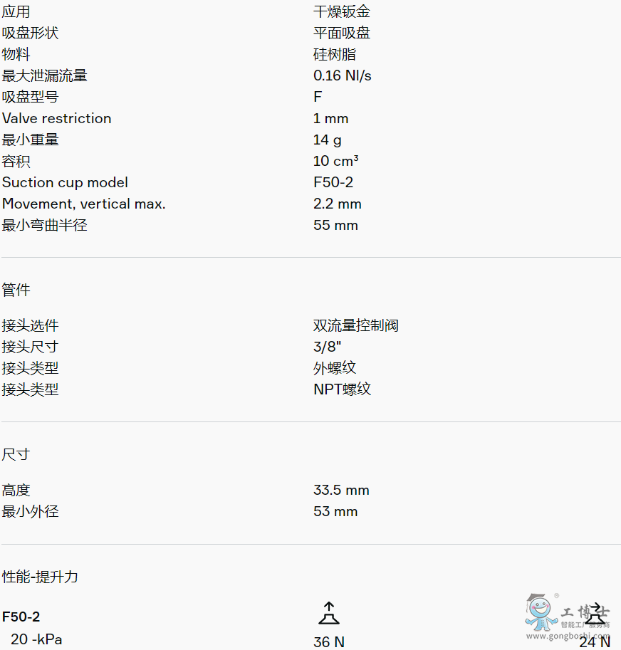 適用于硬紙板、鈑金、玻璃和多孔材料等平坦工件。該吸盤采用夾板結構,不僅可防止工件被吸入吸盤內部而導致變形,而且在提升力平行作用于工件表面時還能增加摩擦力。產品穩定性好,在工作期間幾乎不會發生任何偏移。