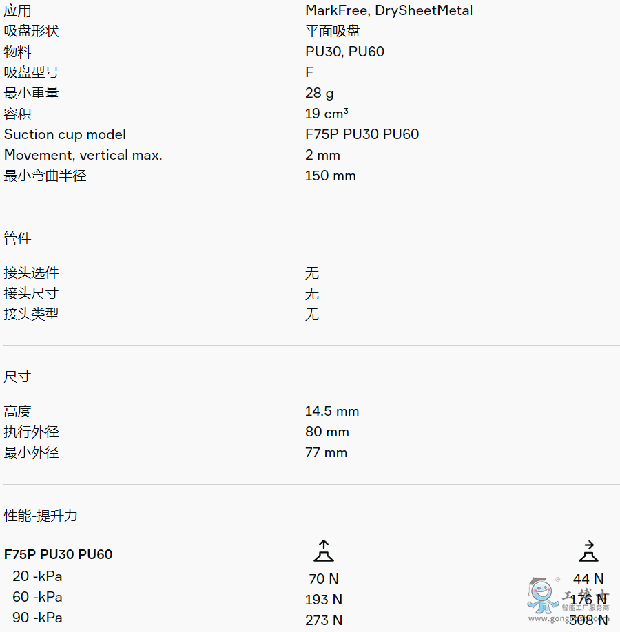 適用于平坦和粗糙表面。該吸盤采用夾板結構,不僅可防止工件被吸入吸盤內部而導致變形,而且在提升力平行作用于工件表面時還能增加摩擦力。產品穩定性好,在工作期間幾乎不會發生任何偏移。這種DURAFLEX®吸盤采用了專門研制的無痕材料,將橡膠的彈性和聚氨酯的耐磨性***地結合在一起。
