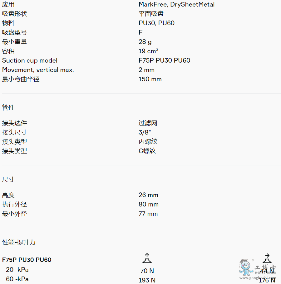 適用于平坦和粗糙表面。該吸盤采用夾板結(jié)構(gòu),不僅可防止工件被吸入吸盤內(nèi)部而導(dǎo)致變形,而且在提升力平行作用于工件表面時(shí)還能增加摩擦力。產(chǎn)品穩(wěn)定性好,在工作期間幾乎不會(huì)發(fā)生任何偏移。這種DURAFLEX®吸盤采用了專門研制的無痕材料,將橡膠的彈性和聚氨酯的耐磨性更好地結(jié)合在一起。