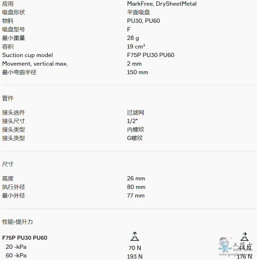 適用于平坦和粗糙表面。該吸盤采用夾板結(jié)構(gòu),不僅可防止工件被吸入吸盤內(nèi)部而導(dǎo)致變形,而且在提升力平行作用于工件表面時(shí)還能增加摩擦力。產(chǎn)品穩(wěn)定性好,在工作期間幾乎不會(huì)發(fā)生任何偏移。這種DURAFLEX®吸盤采用了專門研制的無(wú)痕材料,將橡膠的彈性和聚氨酯的耐磨性更好地結(jié)合在一起。
