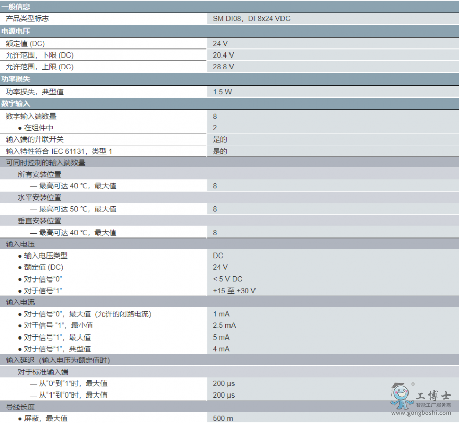 SIMATIC S7-200 SMART, 數字輸入 SM DI08, 8 DI,24V DC,灌電流/拉電流。