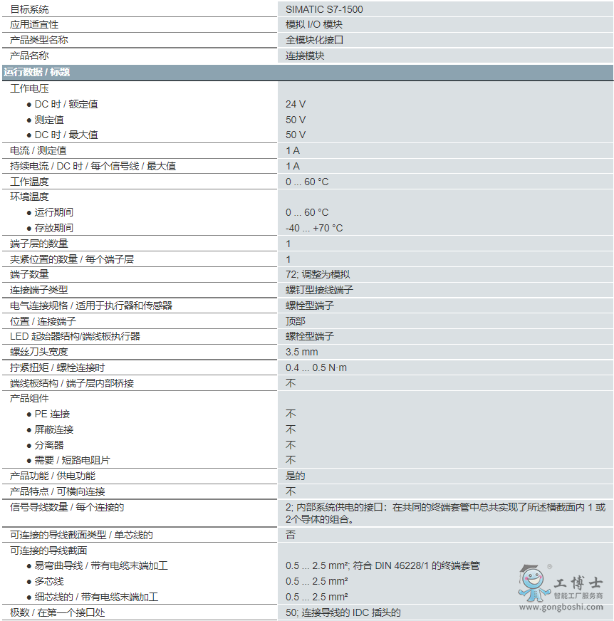 連接模塊 TPA 3 排,用于 SIMATIC S7-1500 的模擬模塊 類型:螺旋端子 沒有 LED,包裝單位 =1 件 50 極 IDC 接口,用于電纜。