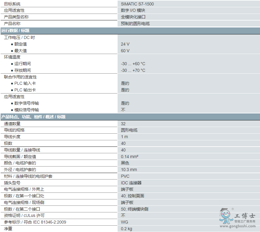連接導(dǎo)線,未屏蔽 用于 SIMATIC S7-1500 64k E/A I/O 模塊 X10 或 X11 與終端模塊 32E/A 之間 0.14 mm2,L = 1.0m,1 個(gè) 40 到 50p。IDC 插頭。