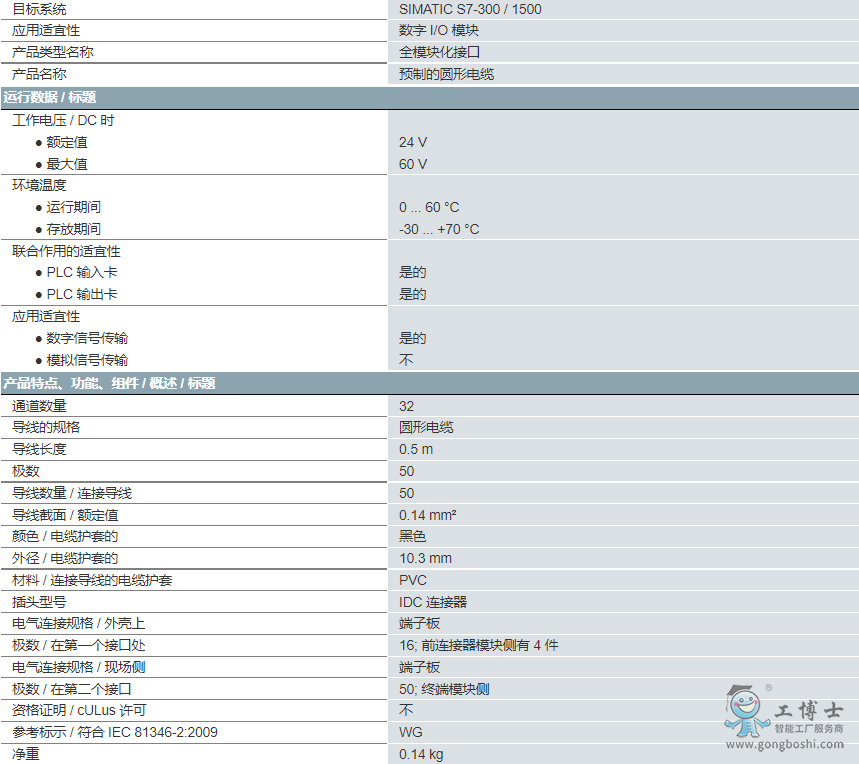 連接導線,未屏蔽 用于 SIMATIC S7-300/1500 0.14mm2 在前連接器模塊(4x16 極) 與連接模塊(1x50 極)之間 帶 IDC 連接器,L = 0.5 m。