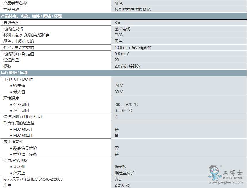 帶前連接器的電纜,用于 SIMATIC S7-300 20 極(6ES7392-1AJ00-0AA0) 插接 50 極 D-SUB 插槽, 用于 ET200M;0.50 mm2 長度 = 8 m。
