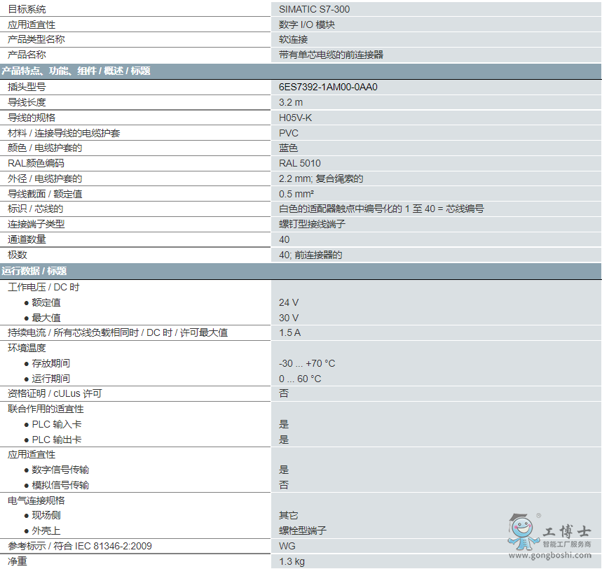 SIMATIC S7-300 的前連接器 40 極(6ES7392-1AM00-0AA0) 帶 40 根 0.5 mm2 單芯線, 單芯線 H05V-K, 螺旋型 包裝單位=1 件 L = 3.2 m。