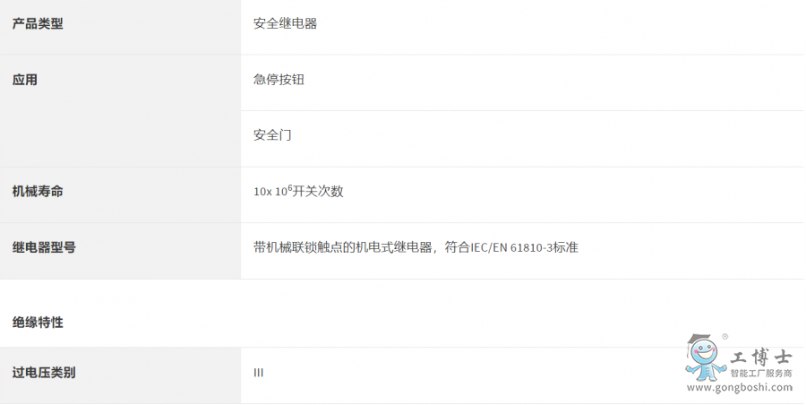安全繼電器,適用于急停和安全門,***高可達SIL 1、SIL CL 1、Cat. 1、PL c安全等級,特定應用場合下***高可達SIL 3、SIL CL 3、Cat. 4、PL e安全等級,單通道操作,4個常開安全觸點輸出,US = 24 V AC/DC,可插拔的直插式接線端子
