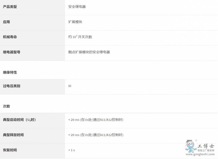單通道或雙通道觸點擴展,5個常開觸點,1個常閉觸點,1個反饋回路,與基本設備一起使用,符合EN ISO 13849安全隔離標準的Cat. 4類PL e級要求,寬度:35 mm,可插拔的螺釘接線端子