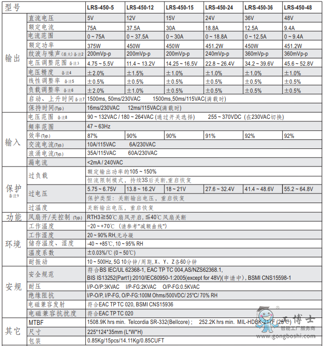 LRS-450系列是一款450W單組輸出封閉型電源供應器,具有35mm低外型設計,采用115VAC或230VAC輸入(通過開關選擇),整系列提供5V, 12V, 15V, 24V, 36V和48V除了效率高達92%,內(nèi)裝長壽命風扇使LRS-450能滿負載工作于-20℃到+70℃的溫度范圍內(nèi)。LRS-450有完整的保護功能和抗5G振動能力;它符合完整的國際安全法規(guī),LRS-450為各種工業(yè)應用提供了一個高性價比的解決方案。
