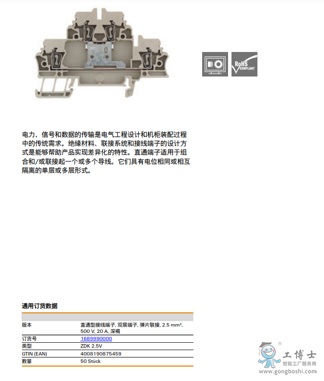 Weidmuller ZDK 2.5V 魏德米勒 直通型接線端子 訂貨號1689990000 |