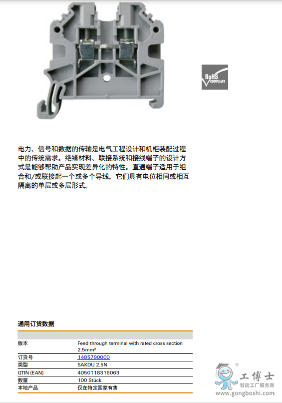 Weidmuller SAKDU 2.5N 魏德米勒 直通型接線端子 訂貨號1485790000 |