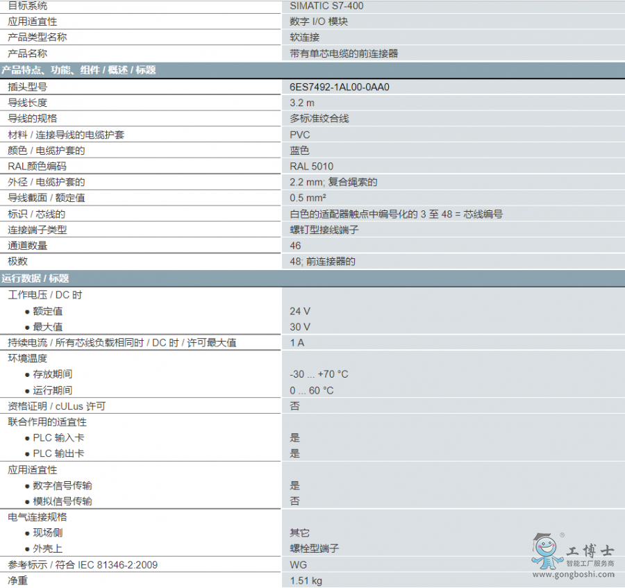 SIMATIC S7-400 的前連接器 48 極(6ES7492-1AL00-0AA0) 帶 46 根 AWG 20 單芯線, 單芯線 UL / CSA AWM 型 1007/1569 FT2 TR64 螺旋型 包裝單位=1 件 L = 3.2 m。