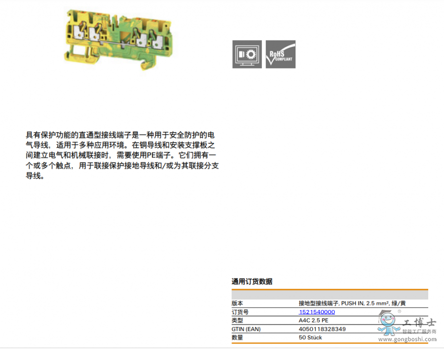Weidmuller A4C 2.5 PE 魏德米勒 接地型接線端子 訂貨號(hào)1521540000
