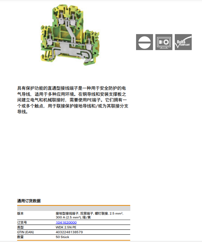Weidmuller WDK 2.5N PE 魏德米勒 直通型接線端子 訂貨號(hào)1041620000