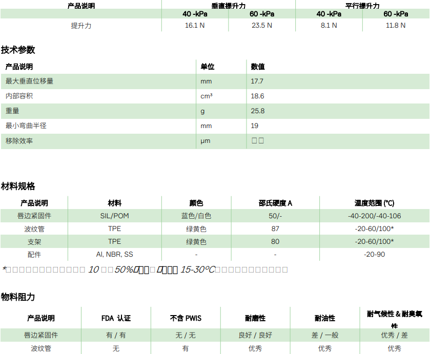 溫度:產(chǎn)品的適宜儲存溫度為 15 °C 至 25 °C [59 °F 至 77 °F]。如果吸盤從低溫儲存環(huán)境下取出,應(yīng)當將其溫度提升至環(huán)境溫度。