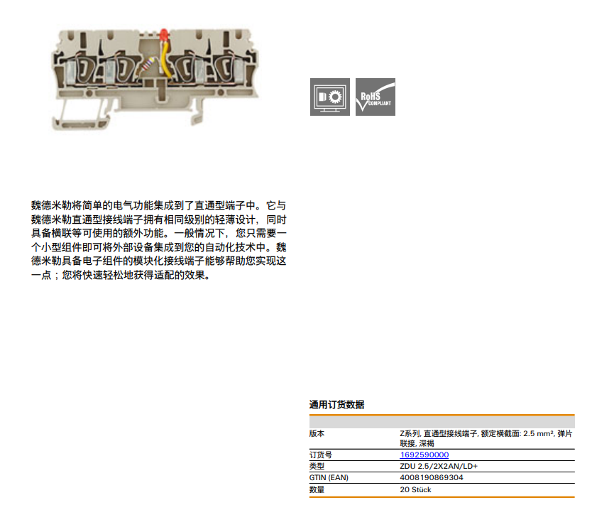 Weidmuller ZDU 2.5/2X2AN/LD+ 魏德米勒帶電子元件的模塊化接線端子 |
