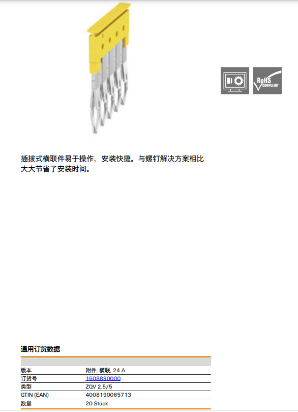 Weidmuller ZQV 2.5/5 魏德米勒 接線端子橫聯件 訂貨號1608890000 |