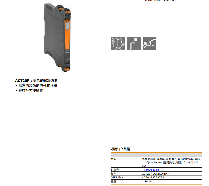 ACT20P-2CI-2CO-ILP魏德米勒weidmulle信號變送器訂貨號7760054358 |