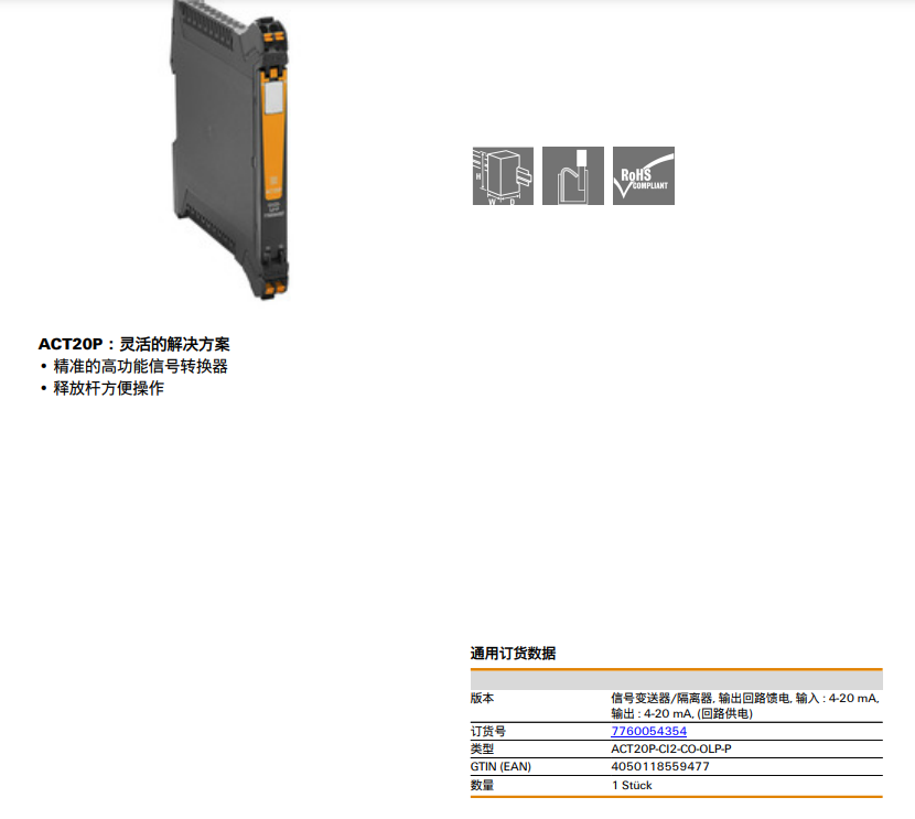 ACT20P-CI2-CO-OLP-P魏德米勒weidmulle信號變送器訂貨號7760054354 |