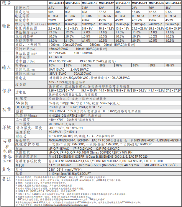 明緯電源:450W單組輸出醫用型開關電源 系列:MSP-450 直流電壓3.3v-48v