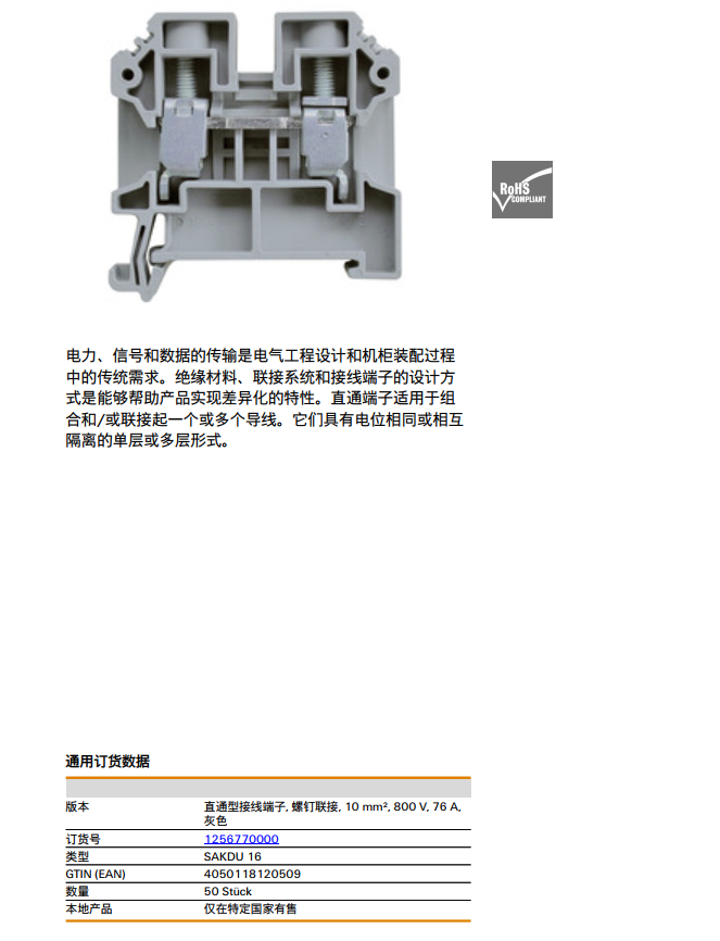 Weidmuller SAKDU 16 魏德米勒 直通型接線端子 訂貨號1256770000 |