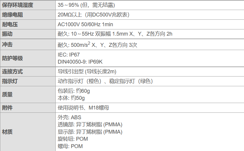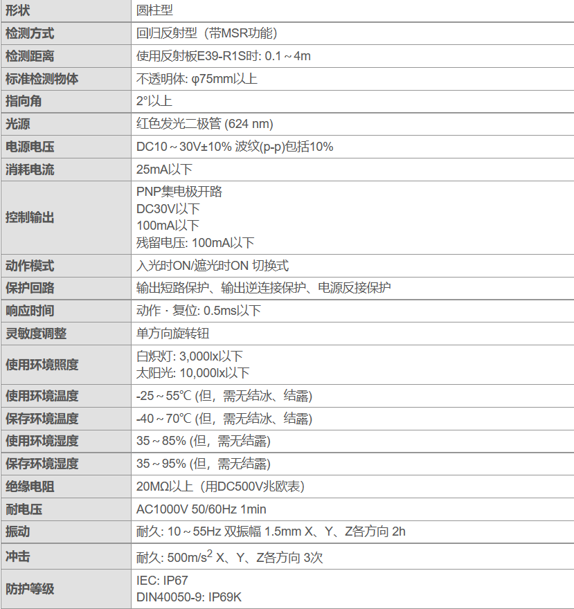 回歸反射型(帶MSR功能), 檢測距離 使用反射板E39-R1S時: 0.1~4m, 入光時ON/遮光時ON 切換式, NPN輸出, 導(dǎo)線引出型 (2m), 紅色發(fā)光二極管 (624 nm)