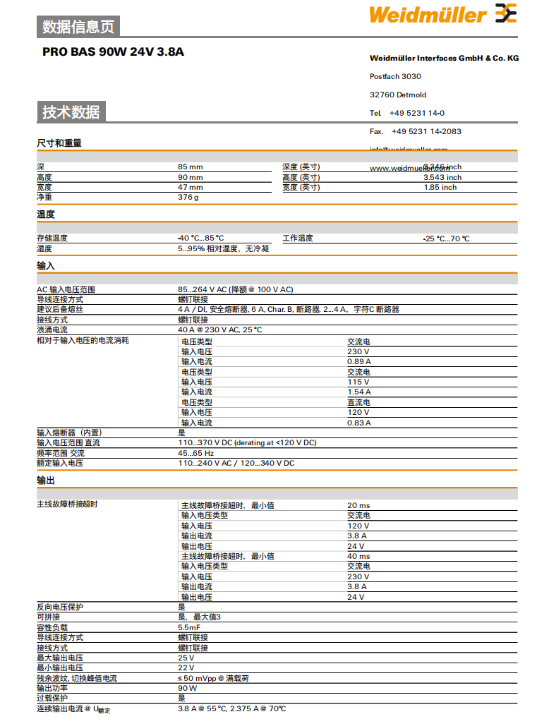 魏德米勒 開關電源 PRO BAS 90W 24V 3.8A 訂貨號2438430000 |