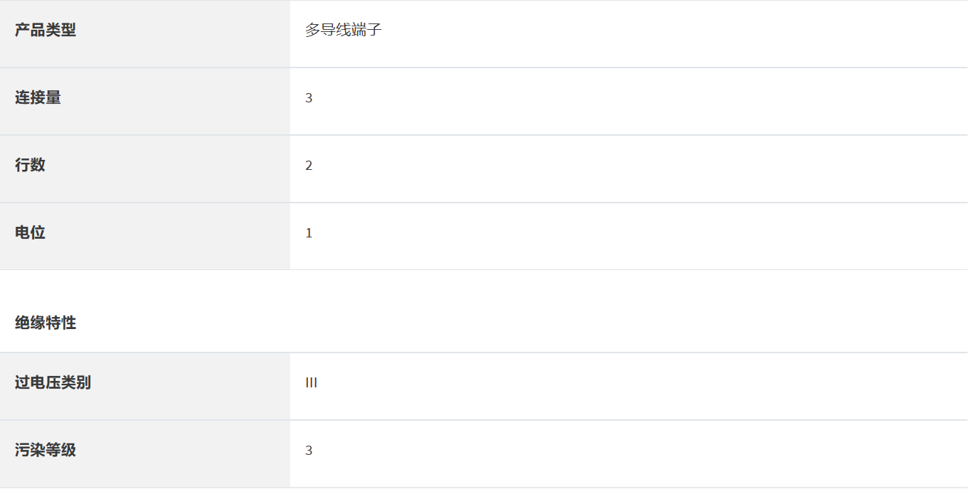 采用單側雙連接的單層端子,接線容量: 0.5-10 mm2, AWG: 24 - 6, 厚度: 10.2 mm,顏色: 灰色