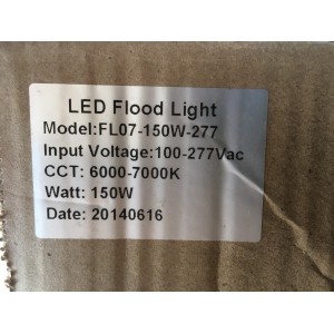 LED Flood light, model FL07-150W-277, Input voltage: 100-277 Vac, CCT: 6000-7000k, Wallt:150W. |