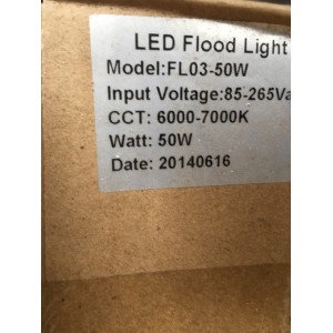 LED Flood light, model FL03-50W, Input voltage: 85-265 Vac, CCT: 6000-7000k, Wallt:50W. |