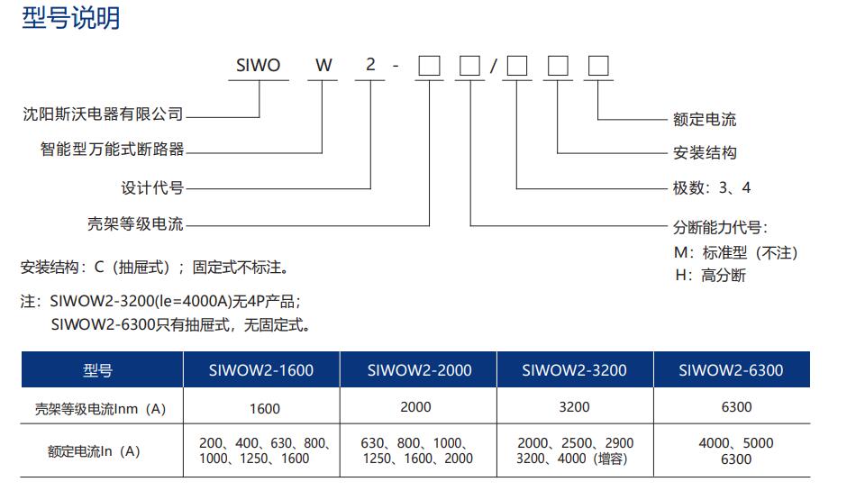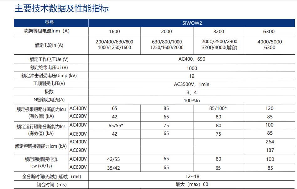 SIWOW2系列智能型***式斷路器(以下簡稱斷路器),適用于交流50Hz,額定電壓至690V,額定電流 6300A及以下的配電網絡中,用來分配電能,保護線路、電源設備及電機免受過載、欠電壓、短路、單相接地等故 障的危害,斷路器可配置各種智能控制器,保護功能齊全,其中通訊型智能控制器帶有通訊接口,便于與現場總線 連接,可實現遙測、遙調、遙控、遙信“四遙”功能,滿足控制自動化的要求。配置漏電互感器及相應的智能控制 器也可實現漏電保護。