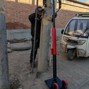 6、在合適位置挖好坑,先把托盤插入坑內(nèi),再把底座頂在托盤上,然后調(diào)節(jié)千斤頂,把線桿調(diào)直即可