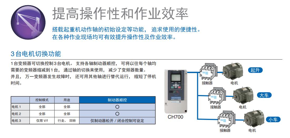新變頻器系列CH700秉持 “多才”、“易用”、“安心”的產品理念, 是專為起重機而優化的產品。 采用融合了以往豐富經驗的制動器順控等**技術, 為起重機操作相關的各種課題提供***佳 “答案”。