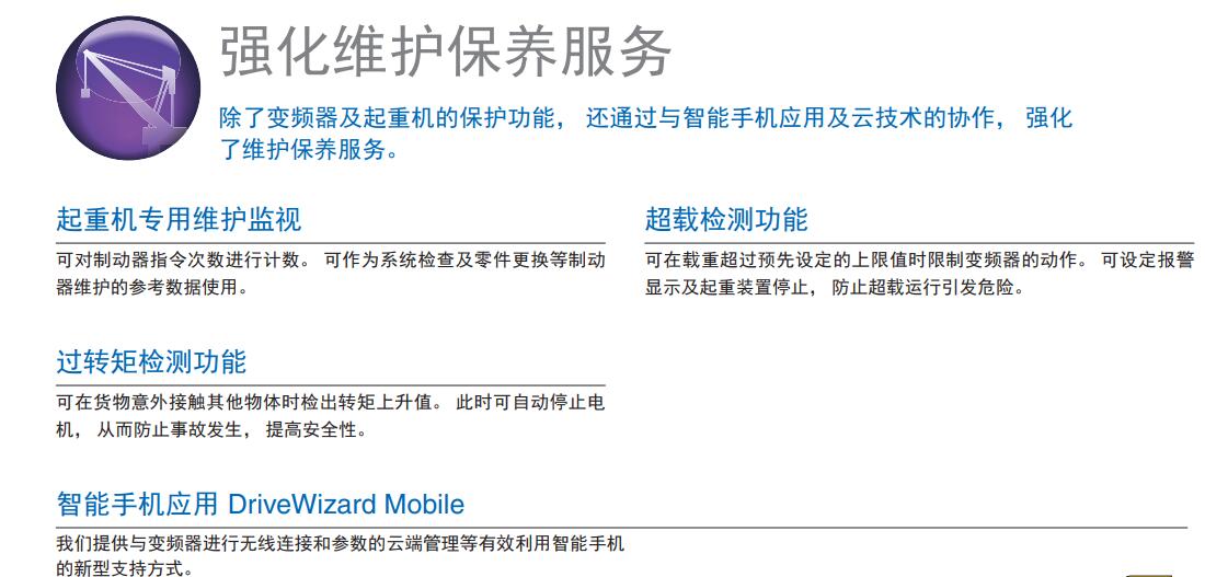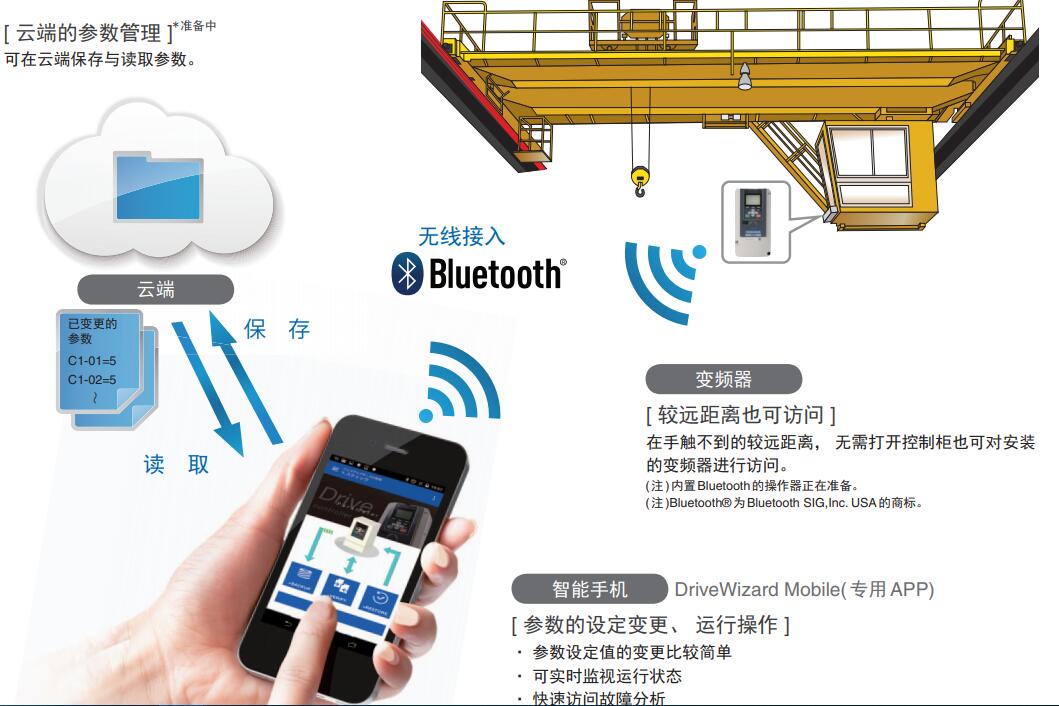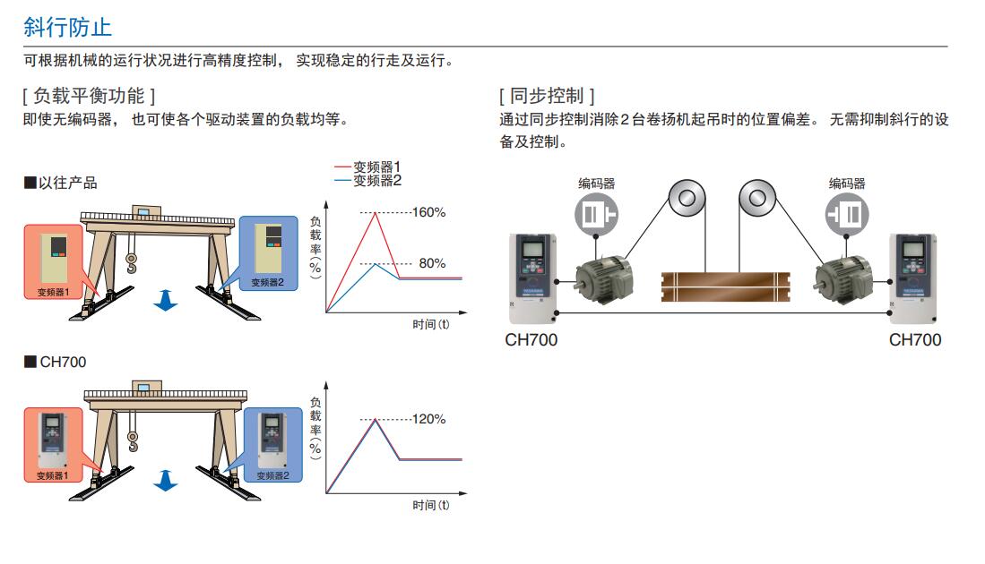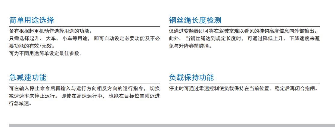 融合安川**技術的高性能變頻器擁有豐富的起重機專用功能。 對改善和提高作業效率大有裨益。