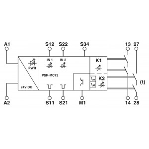 菲尼克斯繼電器,用于急停、安全門和光柵,安全等級可達SIL 3、Cat. 4、PL e,單通道或雙通道運行,自動或手動、受控啟動,3個啟用電流路徑,US = 24 V DC,插拔式螺釘接線端子