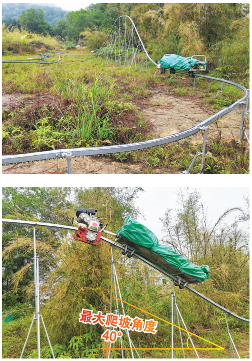 2、整個運輸裝備架設于離地一定高度的軌道上,能實現避開陡峭地形和茂密枝葉,保證農業生產資料和果實運輸不受地形地勢影響。
