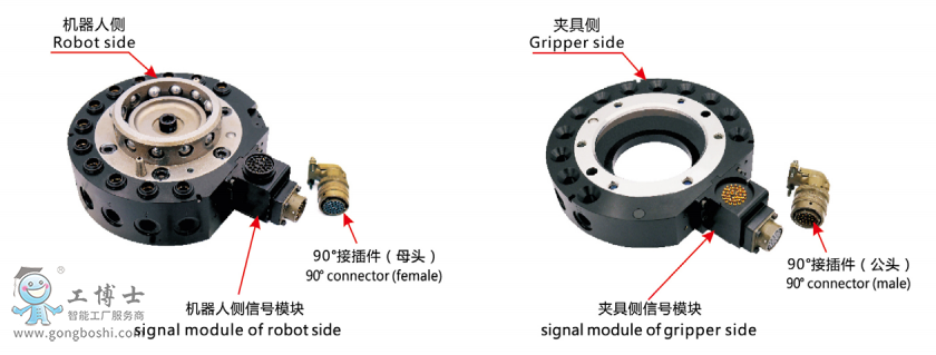 機器人快換裝置,又叫機器人快換盤、換槍盤、快換工具盤、快速更換器、快換器、 快換夾具、治具快換等,它是工業機器人行業使用在末端執行器的一種柔性連接工具。工業機器人快換盤是高性能工業機器人系統上主要的組成部分,能夠是機器人充分發揮性能,完成多種作業,提高機器人的性價比。機器人快換盤包括一個機器人側(主盤)用來安裝在機器人手臂上,還包括一個工具側(副盤)用來安裝在末端執行器上。工具快換裝置能夠讓不同的介質如:壓縮空氣、電信號、液體、視頻、超聲等從機器人手臂連通到末端執行器。
