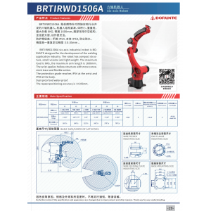 BRTIRWD1506A six axis industrial robot is Guangdong Bo Langte Intelligent Equipment Co., Ltd designed for the development of the welding application industry. The robot has compact structure, small volume and light weight The maximum load is 6KG, the maximum arm length is 1500mm. The wrist applies hollow structure with more convenient trace and flexible action. The protection grade reaches IP54.The repeatability is ±0.06mm.
