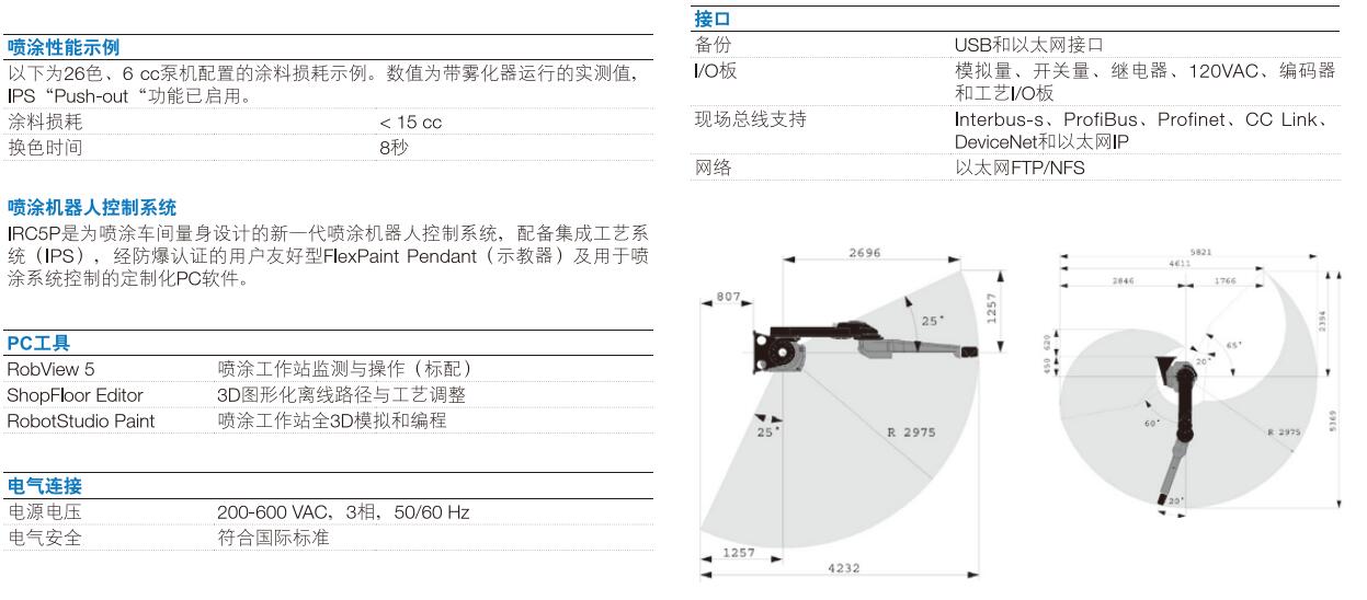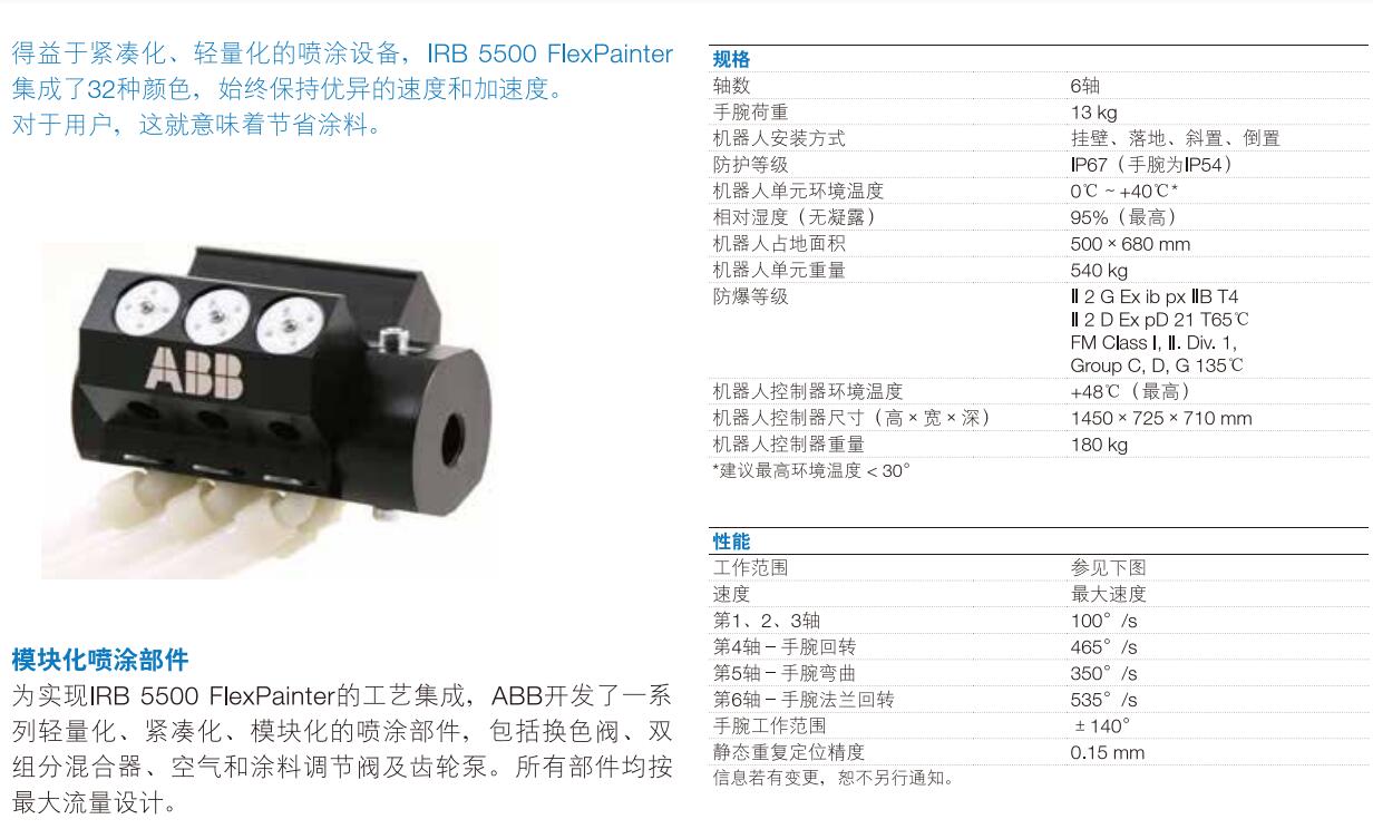 IRB 5500 FlexPainter集噴涂設(shè)備于一 體,旨在打造更佳的涂裝品質(zhì)。該機(jī)器人工作范圍大、加速性能優(yōu)異、噴涂速度快,基本適合于任何應(yīng)用的柔性**解決方案。