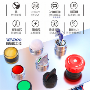威德諾WINDOO--替代進口品牌以上價格為:金屬頭+復位+一常開+LED燈,具體規格及價格請咨詢客服!1、Ith:25 A大電流設計;2、1S快插接線;3、拆裝無需工具;4、頭部60663鋁氧化或PA66可選;5、V0無鹵阻燃材料,耐溫環保;