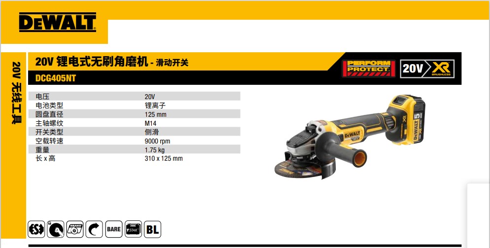 得偉20V 鋰電式無刷角磨機 - 滑動開關 DCG405NT